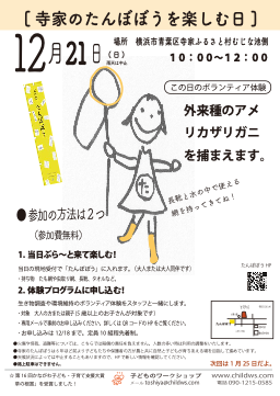 ●持ち物長靴・帽子・たも網や虫取り網・タオル・手袋(軍手など)・手洗い用の水、必要に応じて着替えなど。